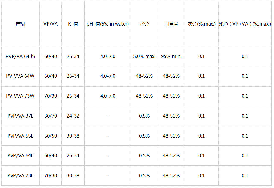 產品特性:VP/VA 產品由不同比例的N-乙烯基吡咯烷酮和醋酸乙烯共聚而成的共聚物,以粉末、液體(包括水溶液和酒精溶液)的形態存在。溶于水、乙醇等多種有機溶劑。具有良好的成模性,且膜堅硬、光澤好、易水洗。