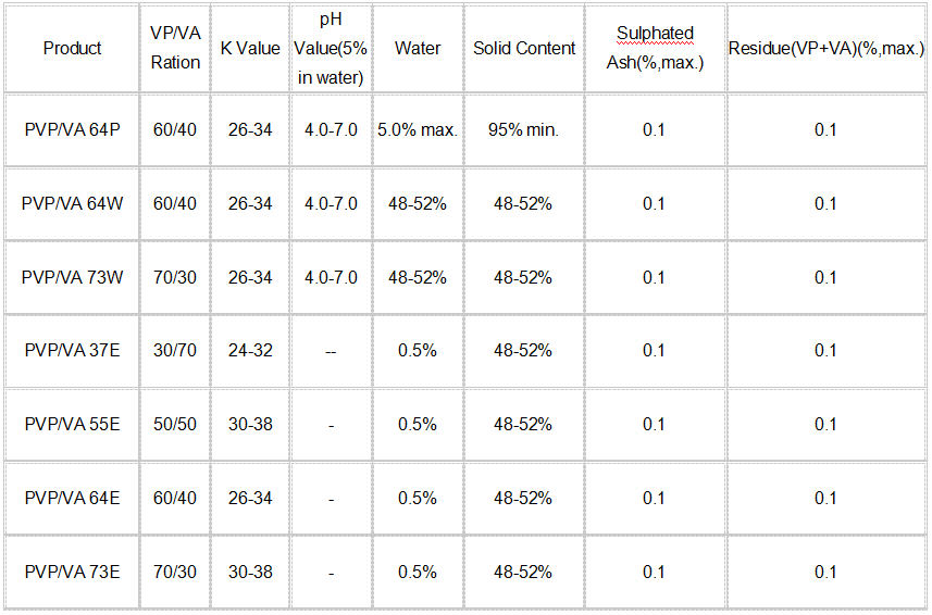 Product Properties:VP/VA Copolymers with different rations of N-Vinylpyrrolidone to Vinyl Acetate,soluble in most organic solvents.Which exists in powder,water solution and ethnol solution form.VP/VA compolymer forms hard,water-removable and glossy films,it has excellent compatibility with many plasticizers and modifiers,and the hydroscopicity decreases in proportion to the ration of Vinyl acetate.